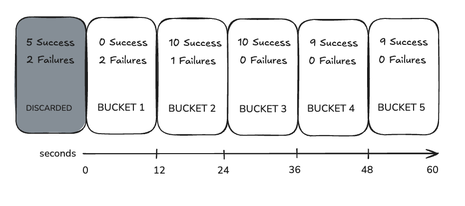 After 60 seconds have elapsed, the circuit breaker has collected a full window of data across all 5 buckets, as illustrated in the diagram below: